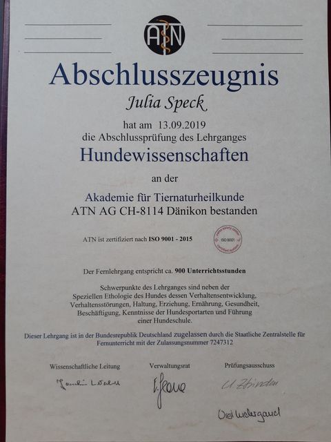 Ich bin Julia Speck und komme aus Sinzheim. Meine bisherigen Erfahrungen im Bereich der Tierpflege, welche aus meiner beruflichen Erfahrung und dem Umgang mit zwei eigenen Tierheimhunden resultieren, baute ich durch einer 2 Jährigen Ausbildung zur Hundetrainerin, an der ATN - Akademie für Tiernaturheilkunde, aus. Neben dieser Ausbildung absolvierte ich noch weitere Fort- und Weiterbildungen, unter anderem in Österreich zur Mantrailing-Trainerin.